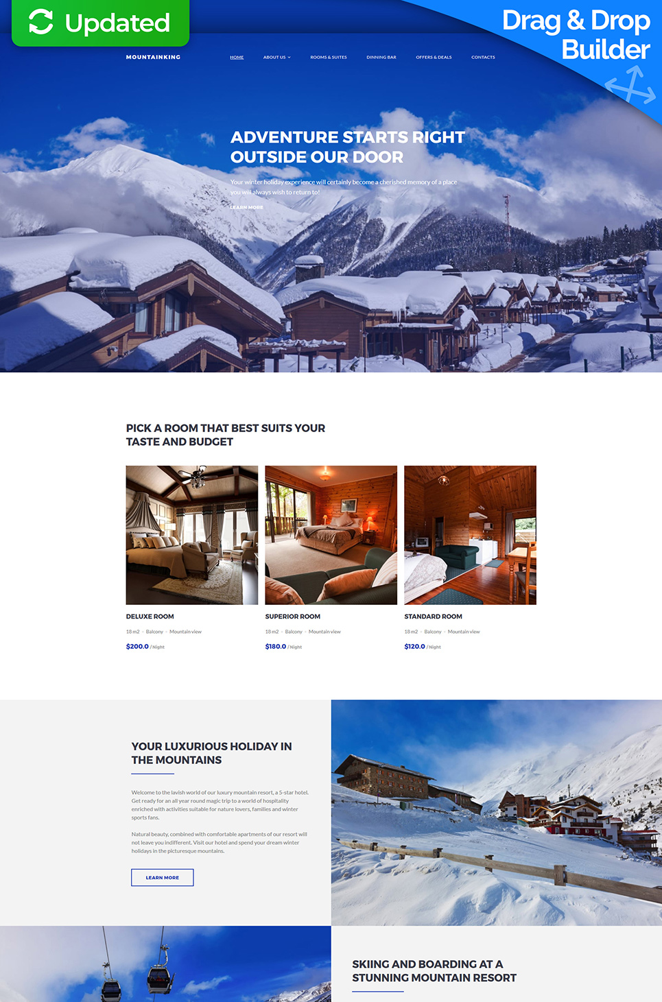 Mountainking - хорошо подходит для сайтов в области Отели. Moto CMS 3 шаблон 2021 года - Mountain Hotel Premium Moto CMS 3 Template.