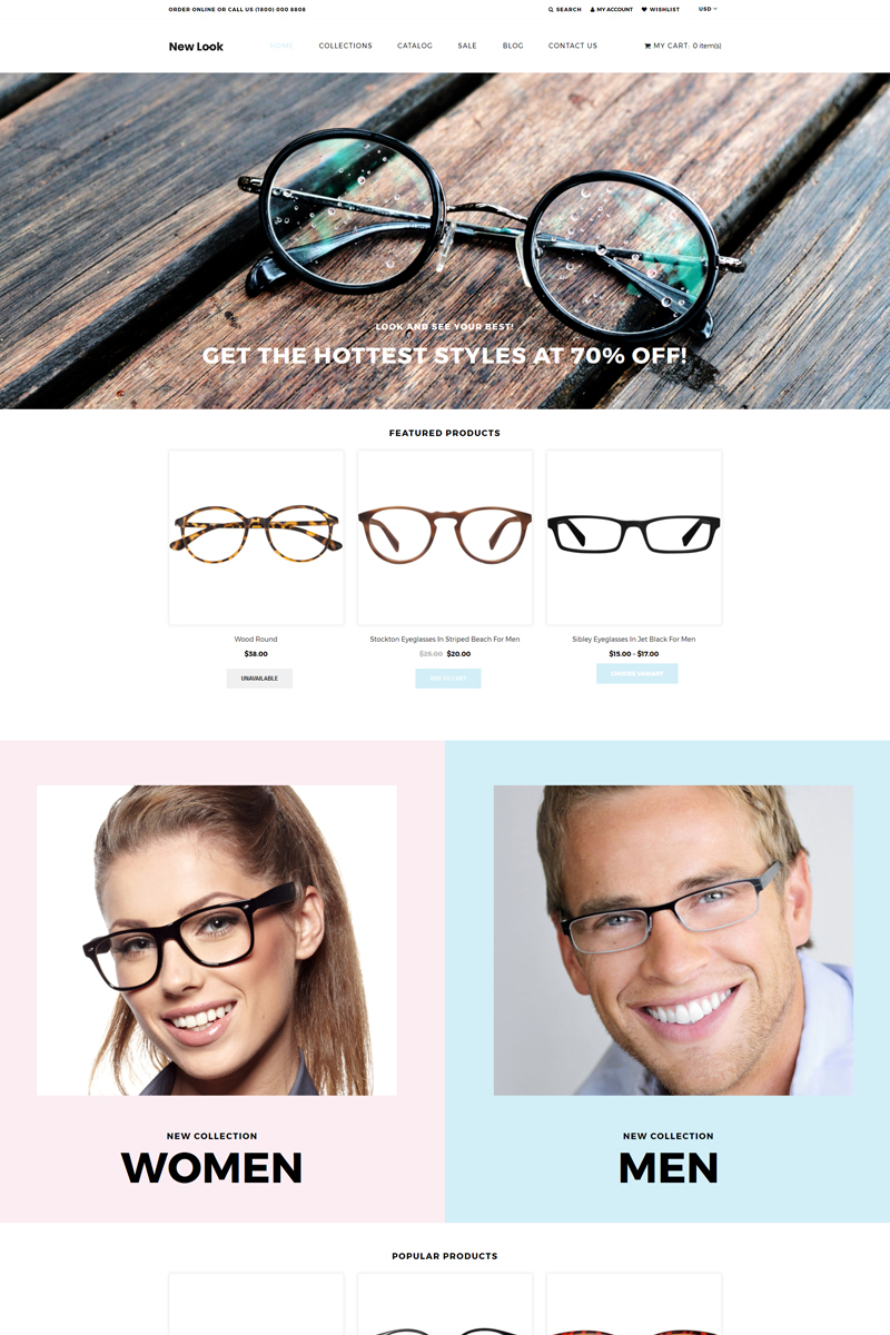 New Look - подходит для сайтов на тему Солнцезащитные очки. Shopify интернет-магазин - Eye Glasses Clean Shopify Theme.