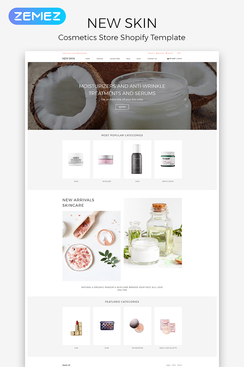 New Skin - подходит для сайтов Магазин косметики. Shopify интернет-магазин для сайта - Cosmetic Store eСommerce Clean Shopify Theme.