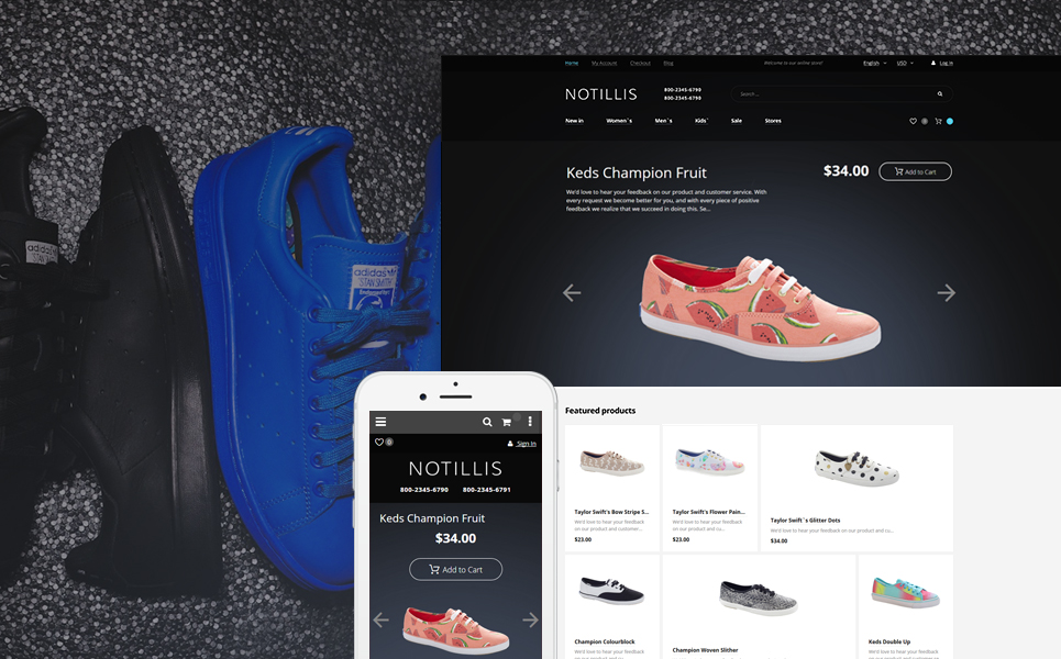 Notillis - отлично подходит для сайтов в категории Теннис. Magento мультишаблон - Shoe Store Responsive Magento Theme.