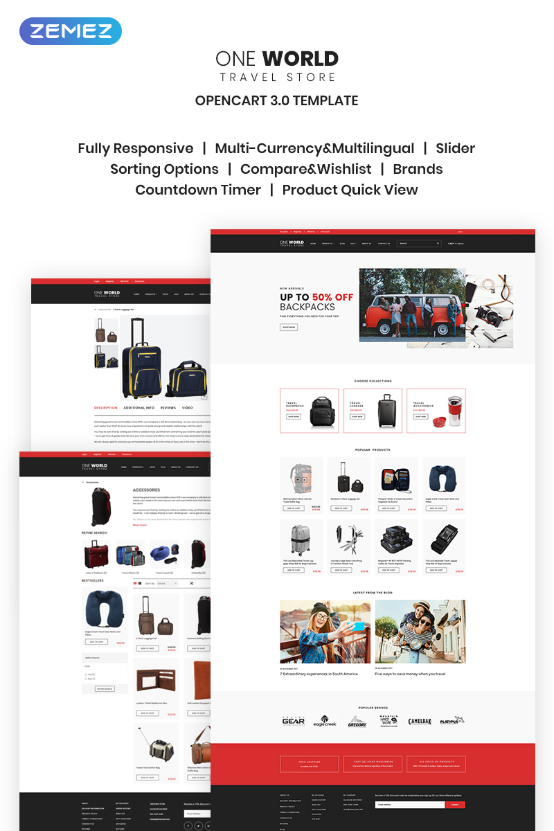 One World - идеально подойдет для сайтов в сфере Магазины товаров для путешествий. OpenCart шаблон для сайта интернет-магазина - Travel Store OpenCart Template.