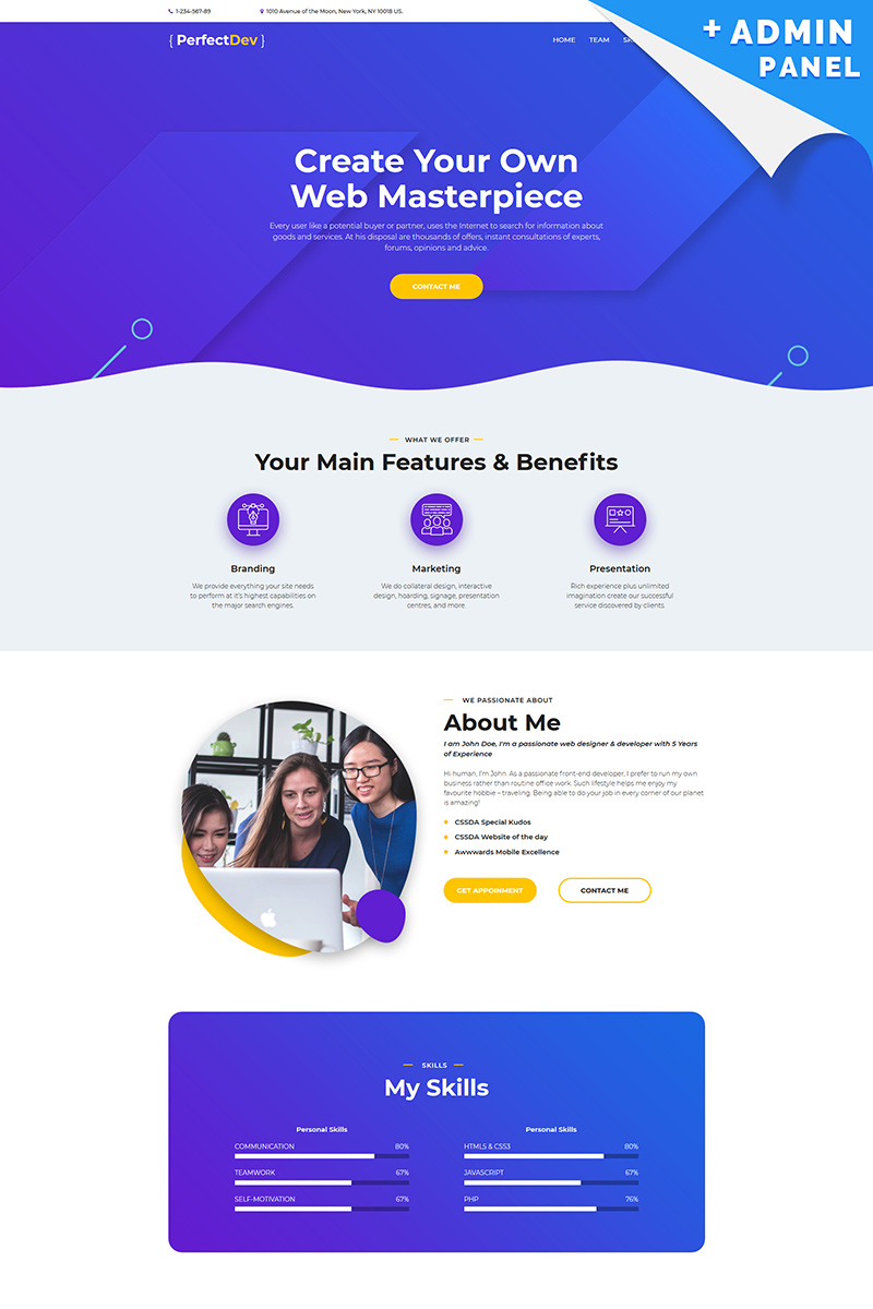 PerfectDev - превосходно подходит для сайтов в области Веб-дизайн. Лендинг шаблон одностраничника - Web Developer Landing Page Template.