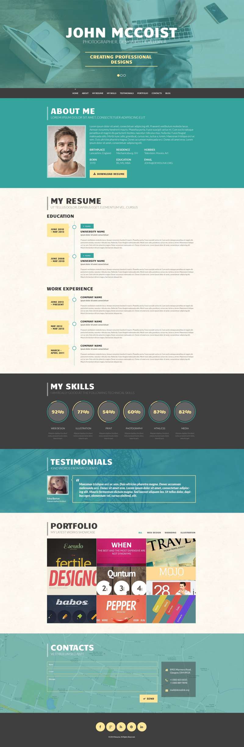 Наш клиент искал простой веб-сайт в стиле резюме, который позволил бы посетителям сайта быстро увидеть обзор того, что они могут предложить. Этот шаблон делает еще один шаг вперед и позволяет пользователю углубиться в отдельные разделы и прочитать более подробную информацию о владельце резюме. Анимация параллакса и контент, загружаемый по требованию, позволяют быстро загружать этот шаблон, но при этом он полон информации.