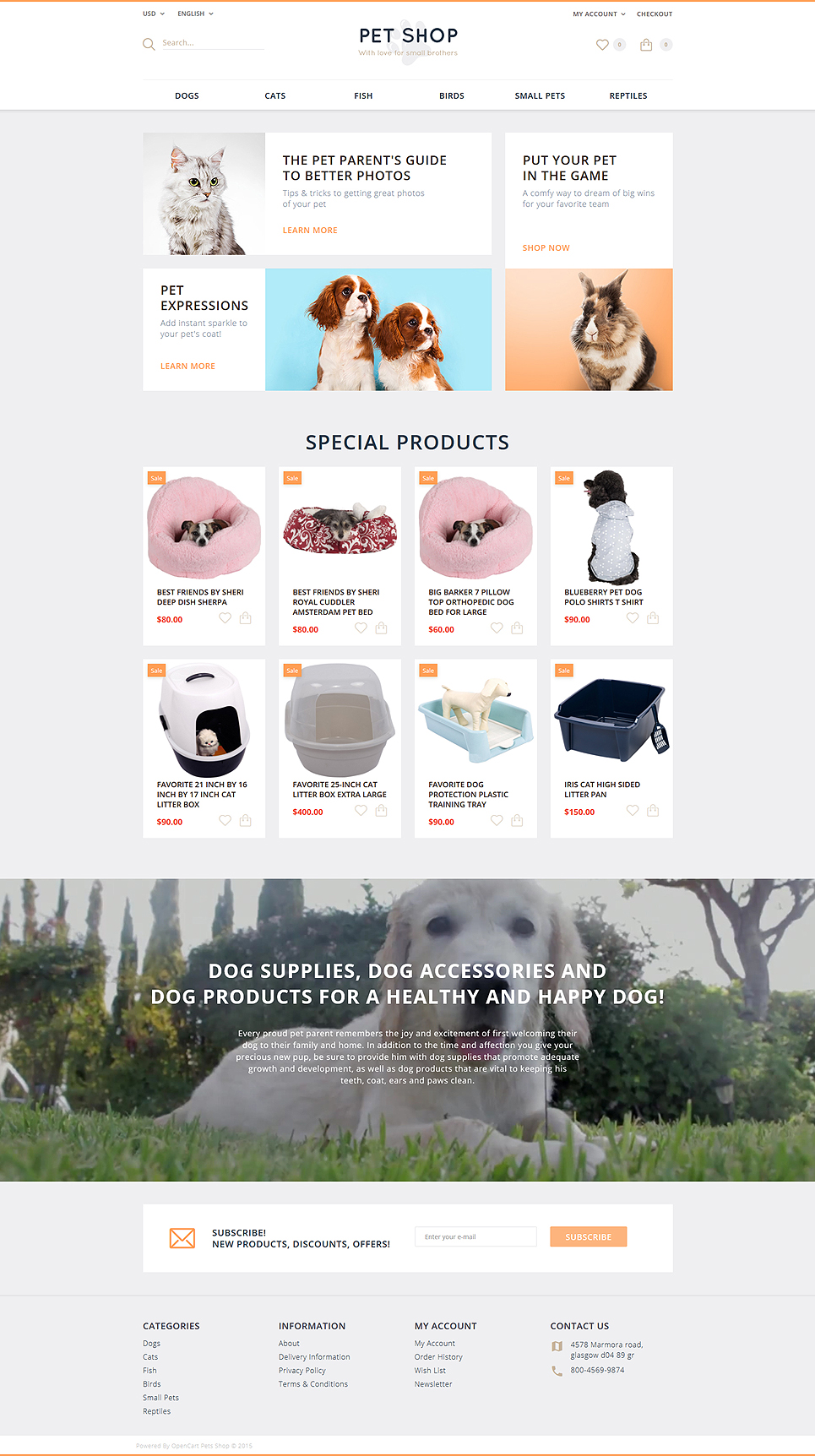 Pet Shop - хорошо подходит для сайтов в категории Зоомагазин. OpenCart шаблон интернет-магазина - Pet Shop OpenCart Template.