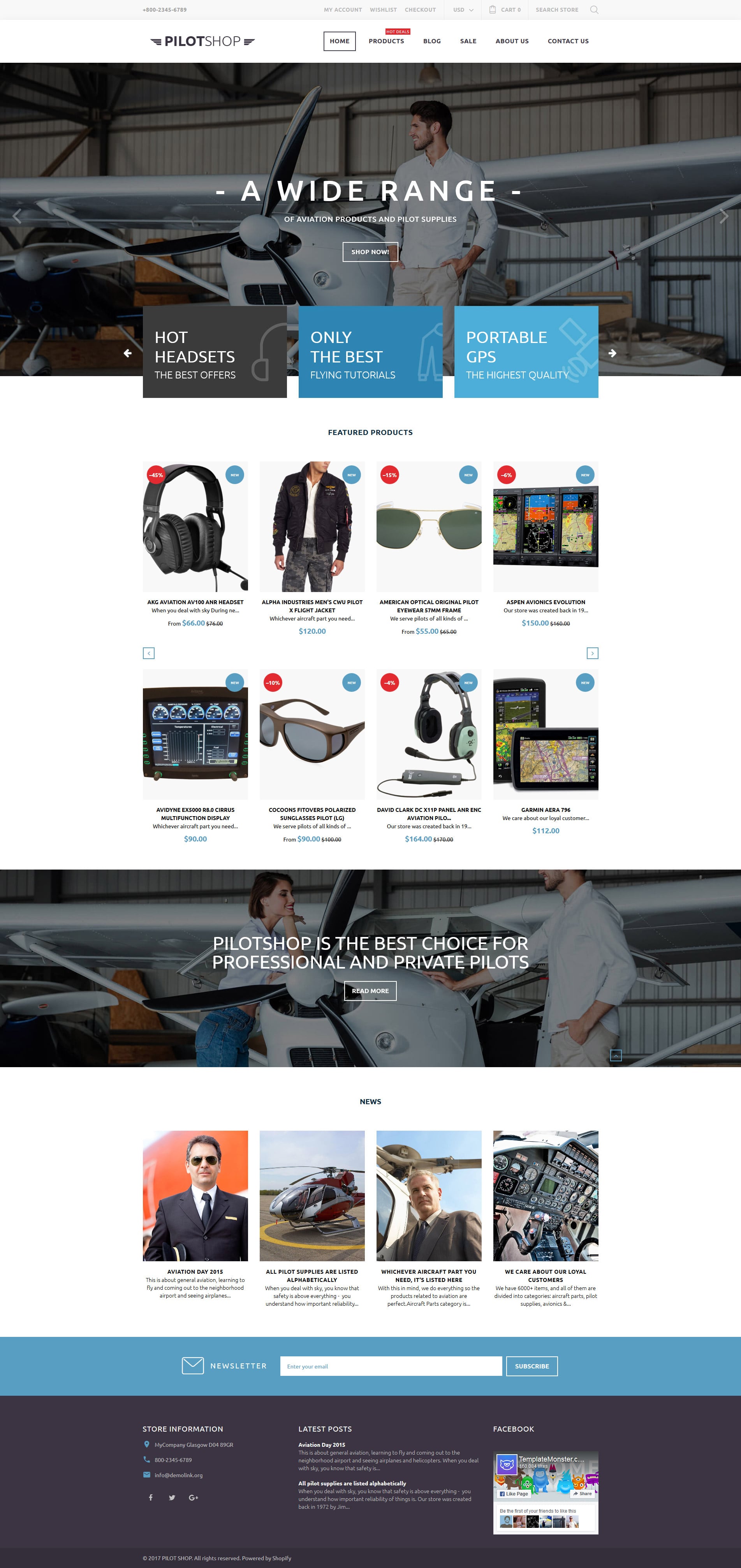 Shopify шаблон для интернет-магазина - PilotShop - Pilot Supplies Responsive Shopify Theme, отлично подойдет для сайтов в области Частные авиалинии.