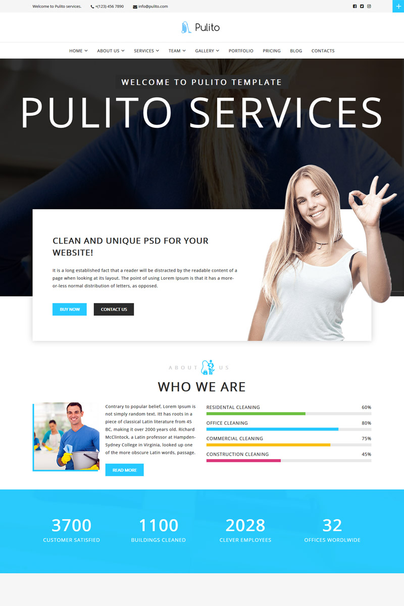 WordPress эффектный шаблон - Pulito - Cleaning Services WordPress Theme, идеально подойдет для сайтов в категории Бизнес и услуги.