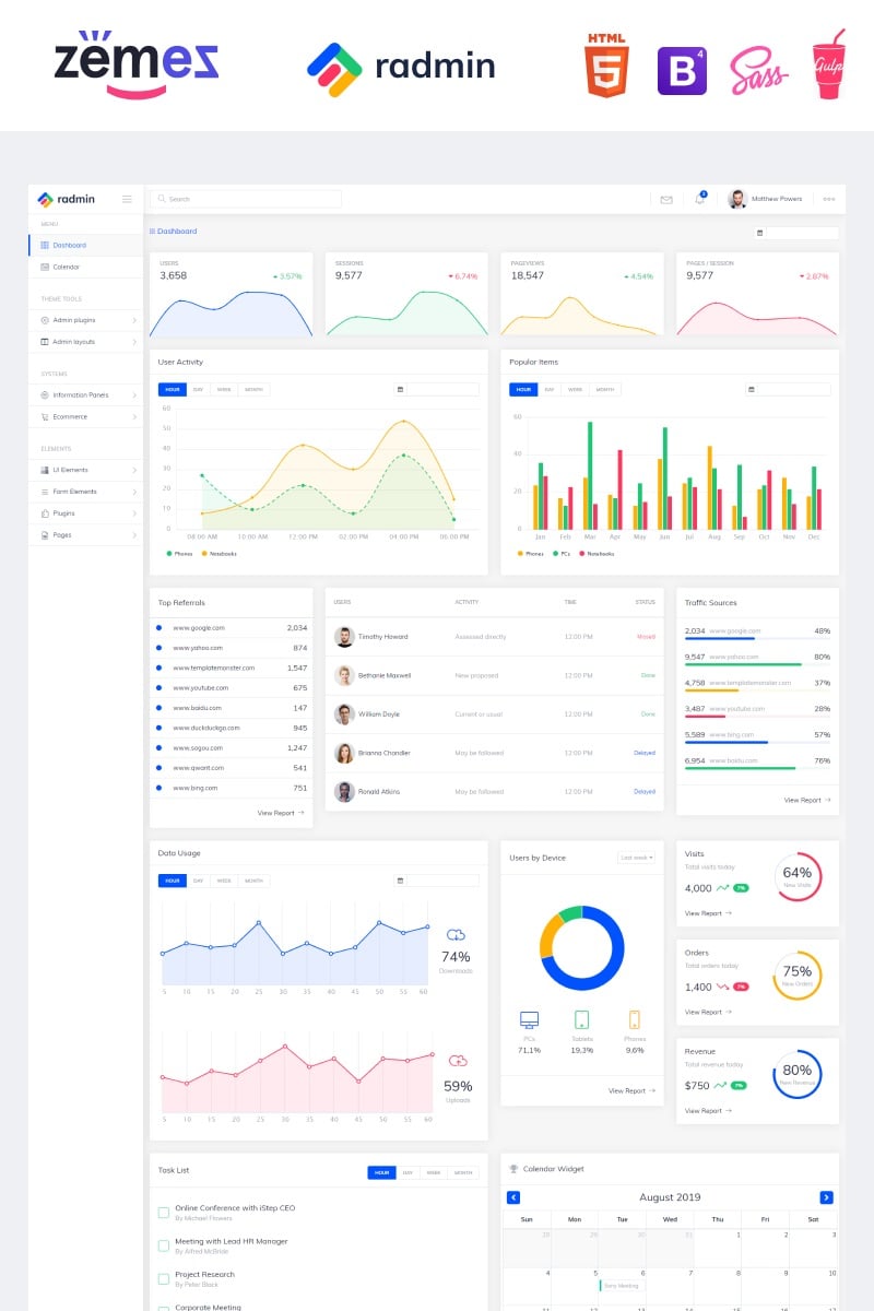 Radmin - идеально подойдет для сайтов Информационные технологии. Панель управления шаблон панели управления - Multifunctional Clean Dashboard Admin Template.