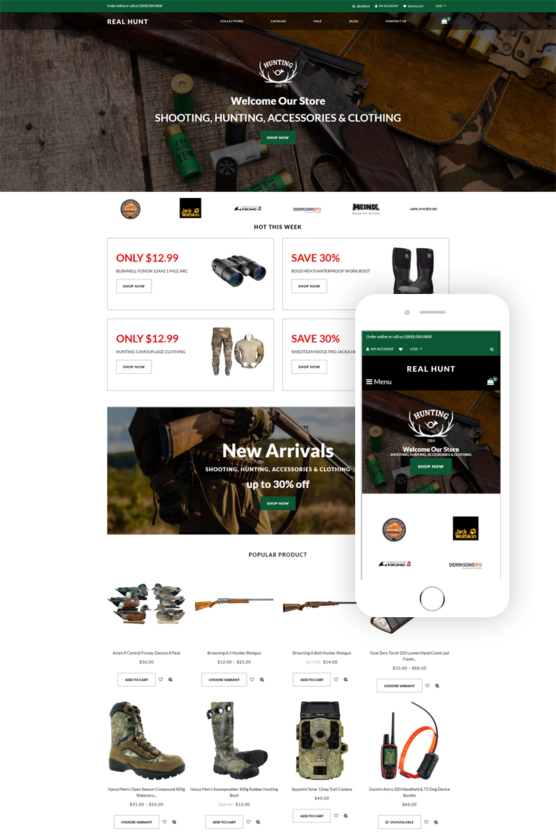 Shopify интернет-магазин для сайта - Real Hunt - Hunting Clean Shopify Theme, отлично подойдет для сайтов на тему Охота.