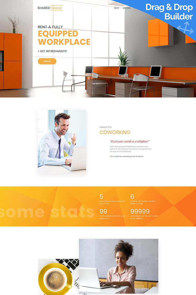 SharedSpace - хорошо подходит для сайтов в сфере Бизнес услуги. Moto CMS 3 современный шаблон - Coworking Moto CMS 3 Template.