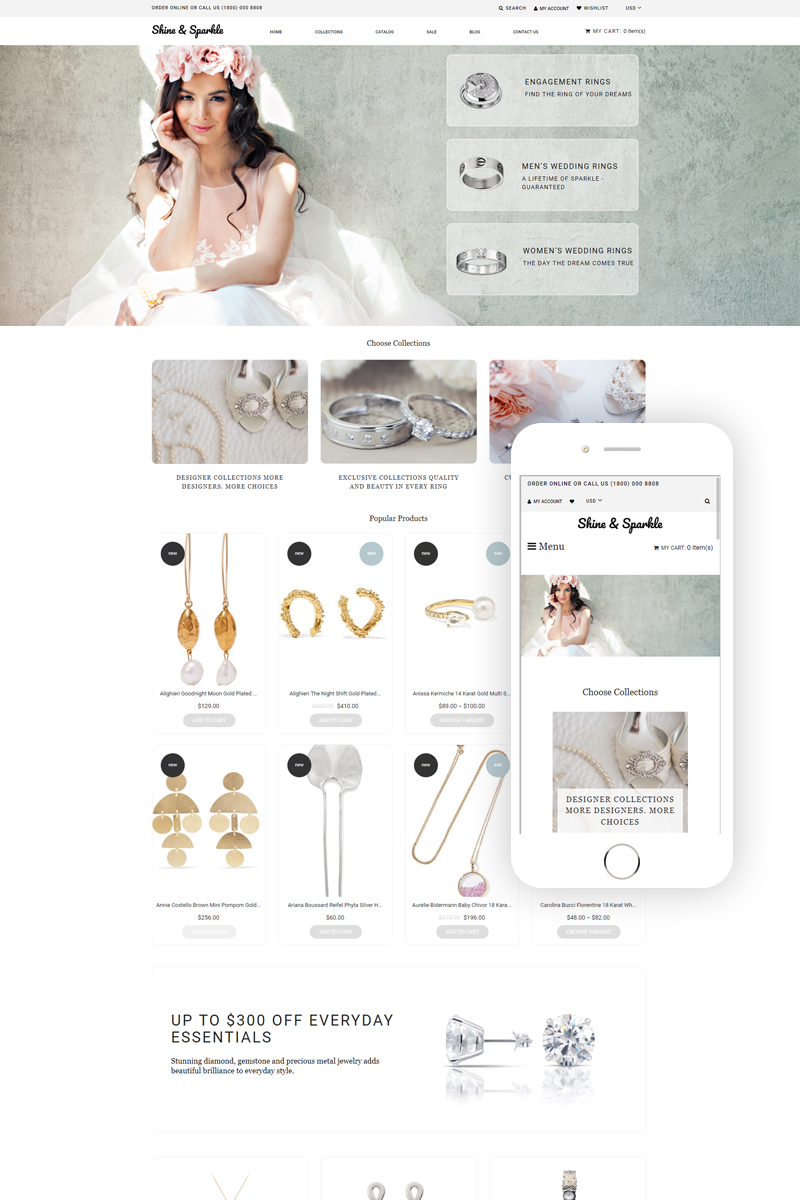 Shopify шаблон для интернет-магазина - Shine & Sparkle - Jewelry Multipage Stylish Shopify Theme, отлично подойдет для сайтов в категории Ювелирные украшения.