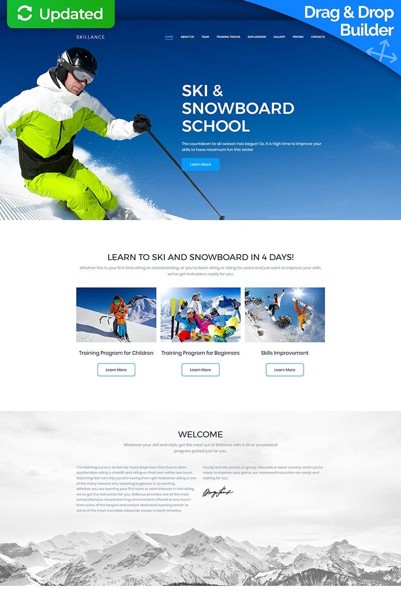 Skiing - хорошо подойдет для сайтов в сфере Катание на лыжах. Moto CMS 3 шикарный шаблон - Ski & Snowboard School Premium Moto CMS 3 Template.