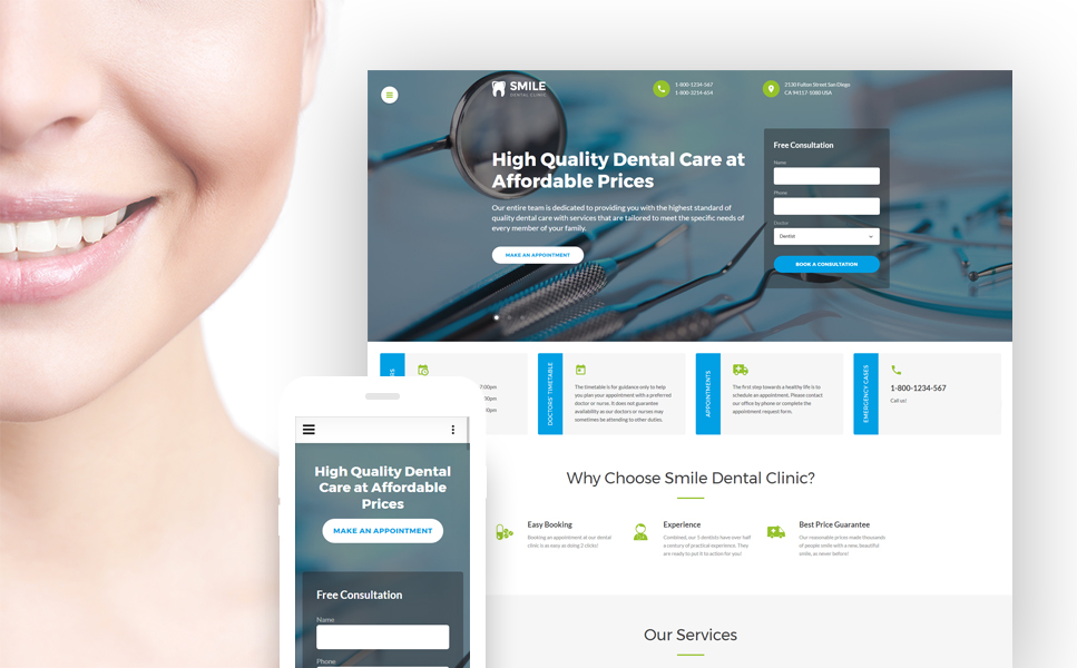 HTML5 шаблон 2021 года - Smile - Dentistry Responsive Multipage HTML Website Template, хорошо подходит для сайтов в категории Стоматология.
