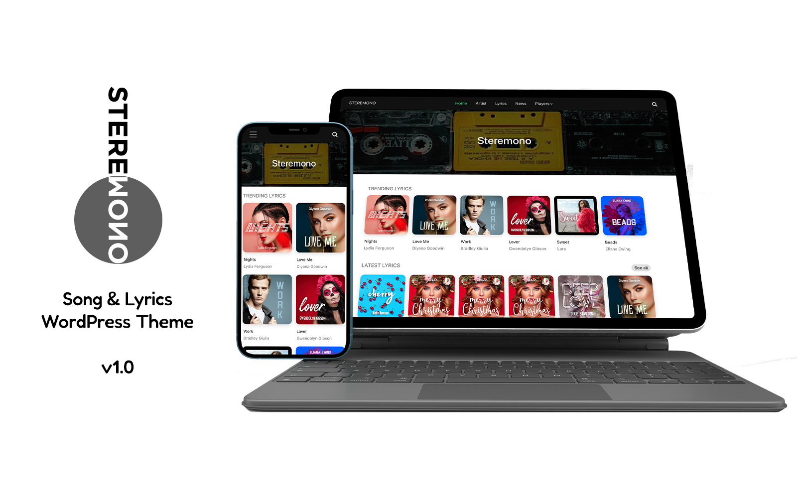 Steremono - хорошо подойдет для сайтов Музыка. WordPress мультишаблон для сайта - Song Lyrics WordPress Music Theme.
