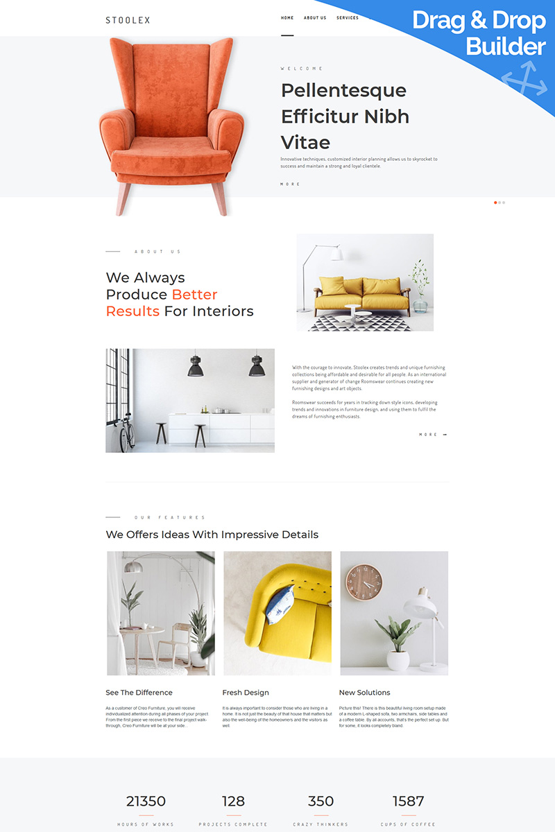 Moto CMS 3 эффектный шаблон - Stoolex - Interior Decoration Moto CMS 3 Template, подходит для сайтов на тему Дизайн интерьеров.