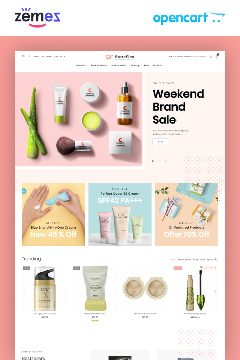 StoreFlex - отлично подходит для сайтов в области Магазин косметики. OpenCart шаблон интернет-магазина - Korean Cosmetics eCommerce Template OpenCart Template.
