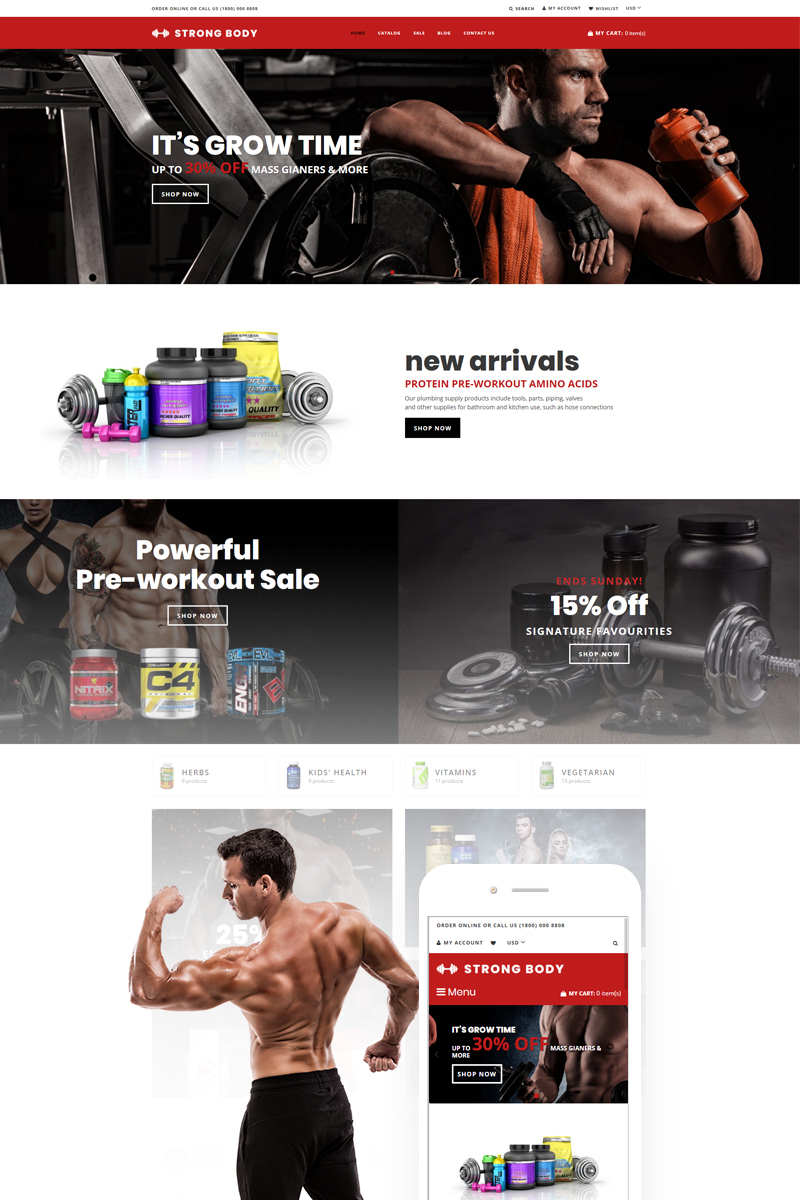 Shopify интернет-магазин для сайта - Strong Body - Sports Nutrition Shopify Theme, идеально подходит для сайтов Спортивный магазин.