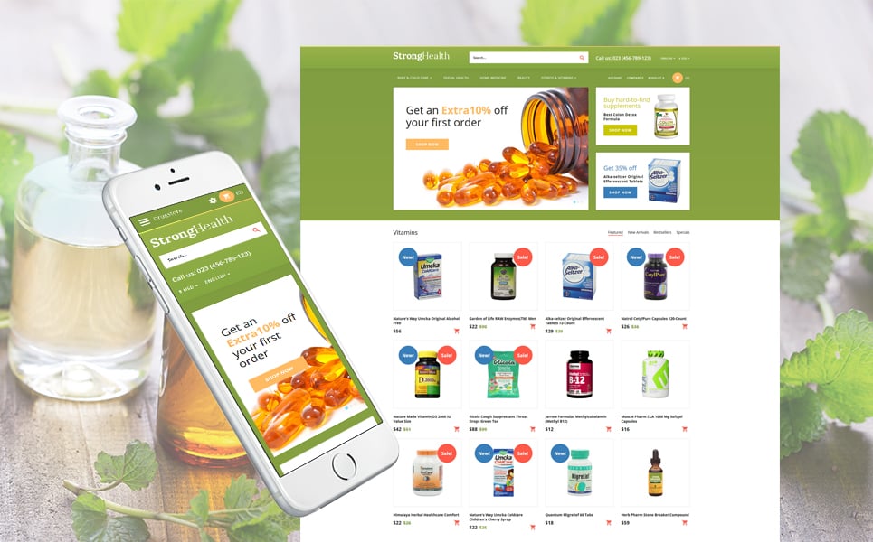 StrongHealth - отлично подойдет для сайтов на тему Аптека. OpenCart шаблон для интернет-магазина - Drugstore OpenCart Template.