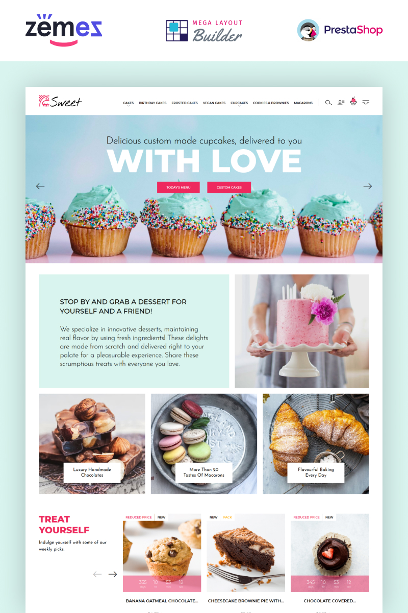 Sweet Dreams - превосходно подходит для сайтов в категории Хлебобулочные изделия. PrestaShop шаблон интернет-магазина - Cake Shop PrestaShop Template PrestaShop Theme.