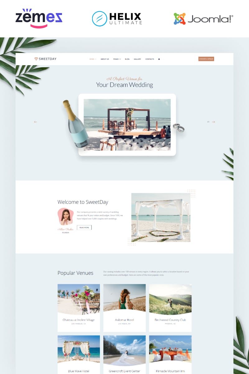 Joomla новый шаблон - Sweetday - Wedding Venues Multipage Joomla Template, специально для сайтов в категории Свадебный зал.