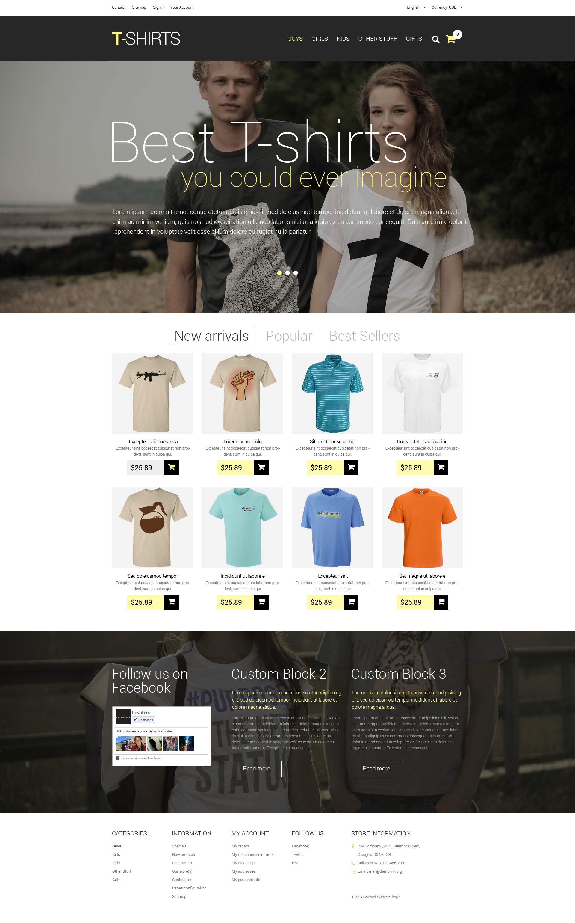 T-shirt Shop - отлично подойдет для сайтов в категории Магазин футболок. PrestaShop интернет-магазин для сайта - Shirts PrestaShop Theme.