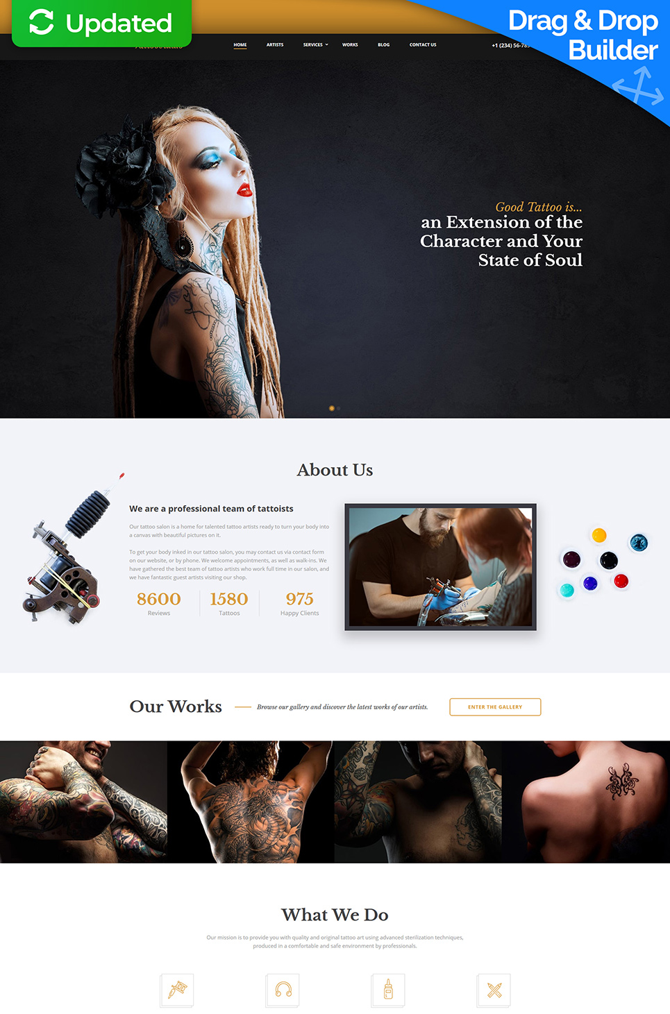 TattooStudio - специально для сайтов в области Тату салон. Moto CMS 3 мультишаблон для сайта - Artist Studio Moto CMS 3 Template.
