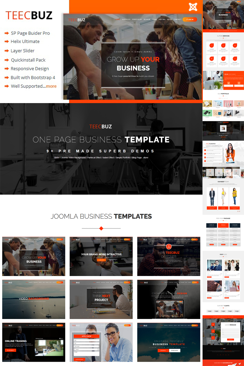 TeecBuz - подойдет для сайтов в области Бизнес услуги. Joomla новый шаблон - Business Onepage Joomla Template.