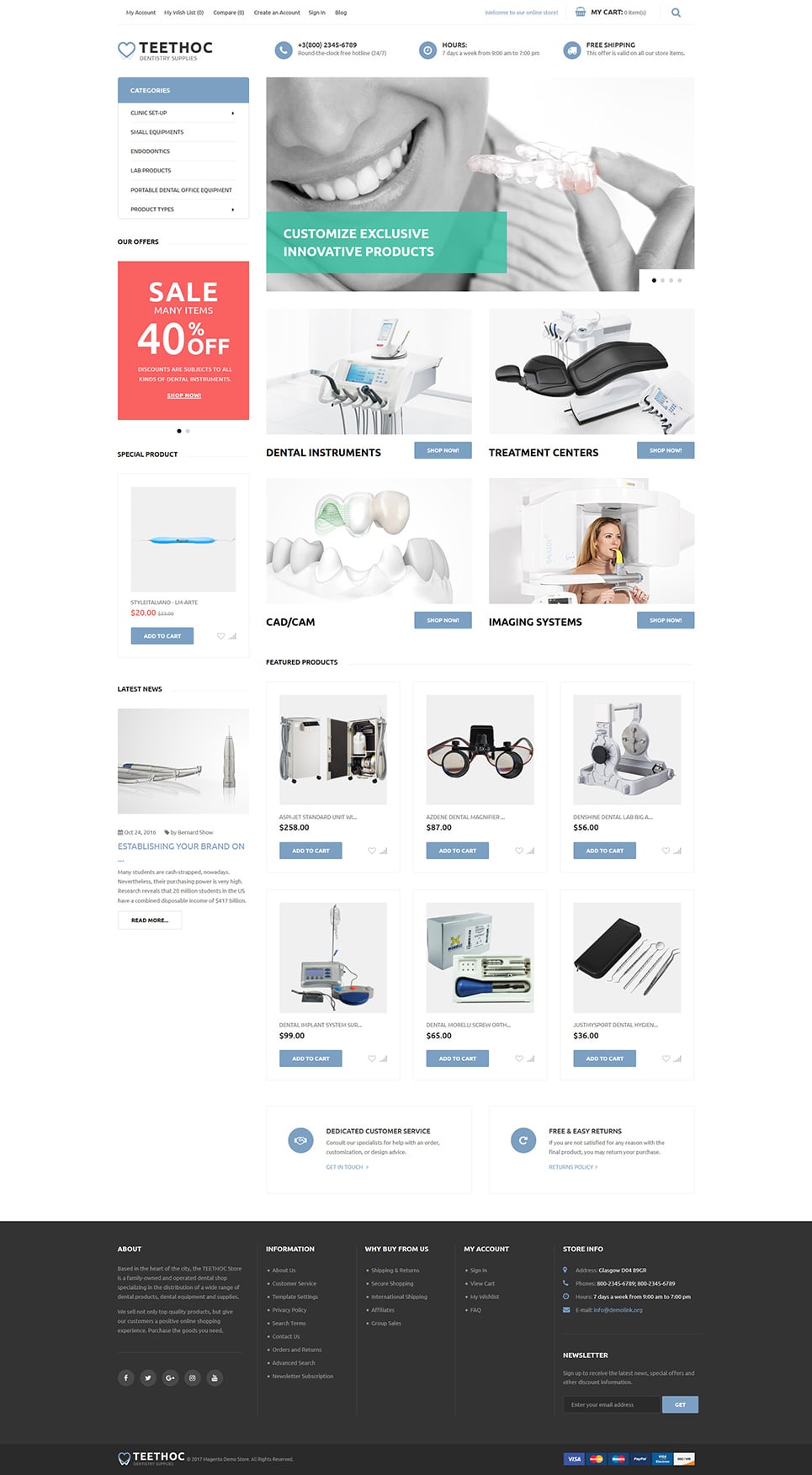 Teethoc - хорошо подходит для сайтов в сфере Стоматология. Magento продаваемый шаблон - Dental Instruments Magento Theme.