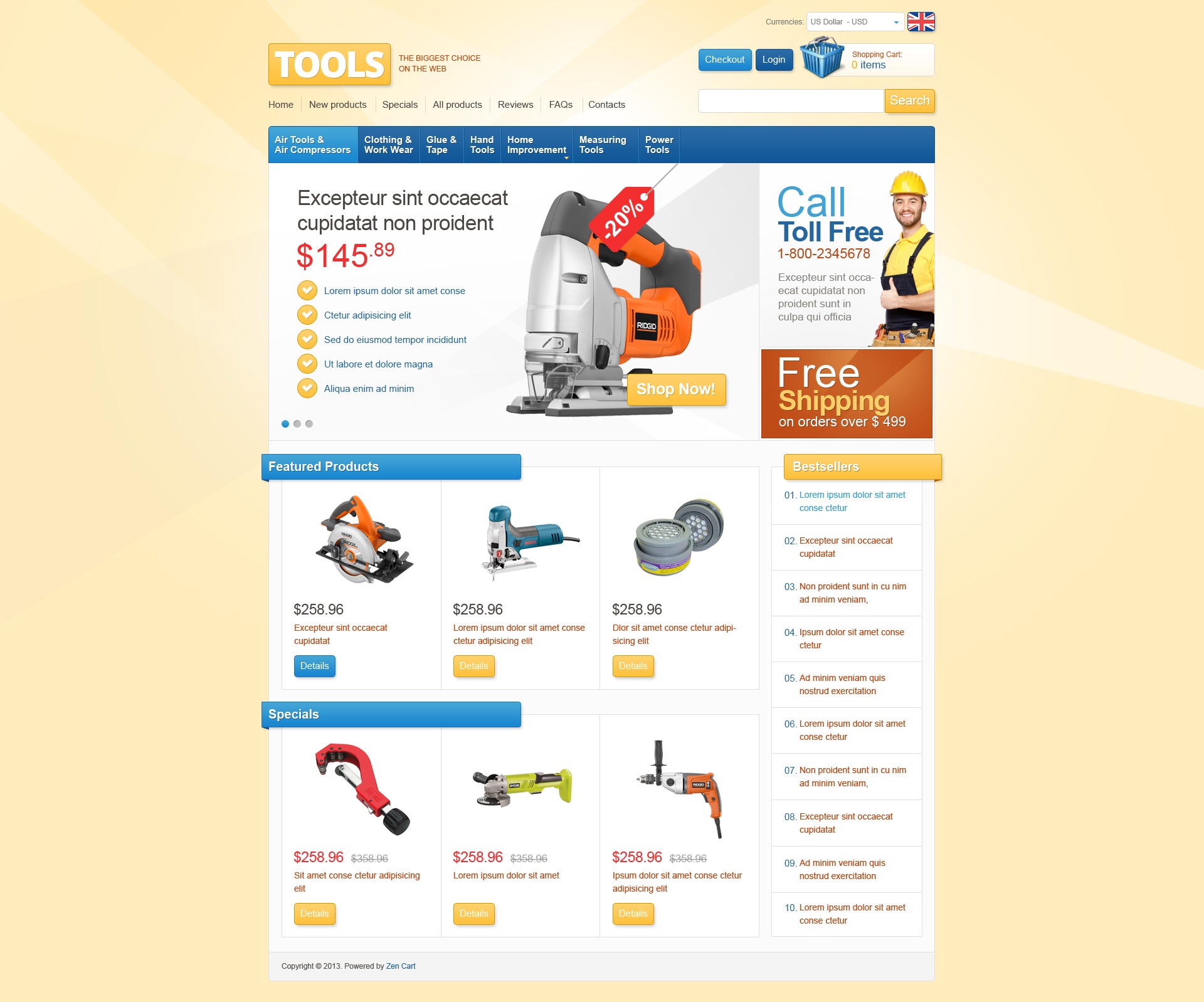 Tools & Equipment - подойдет для сайтов в области Инструменты и оборудование. ZenCart интернет-магазин - Tools Store ZenCart Template.