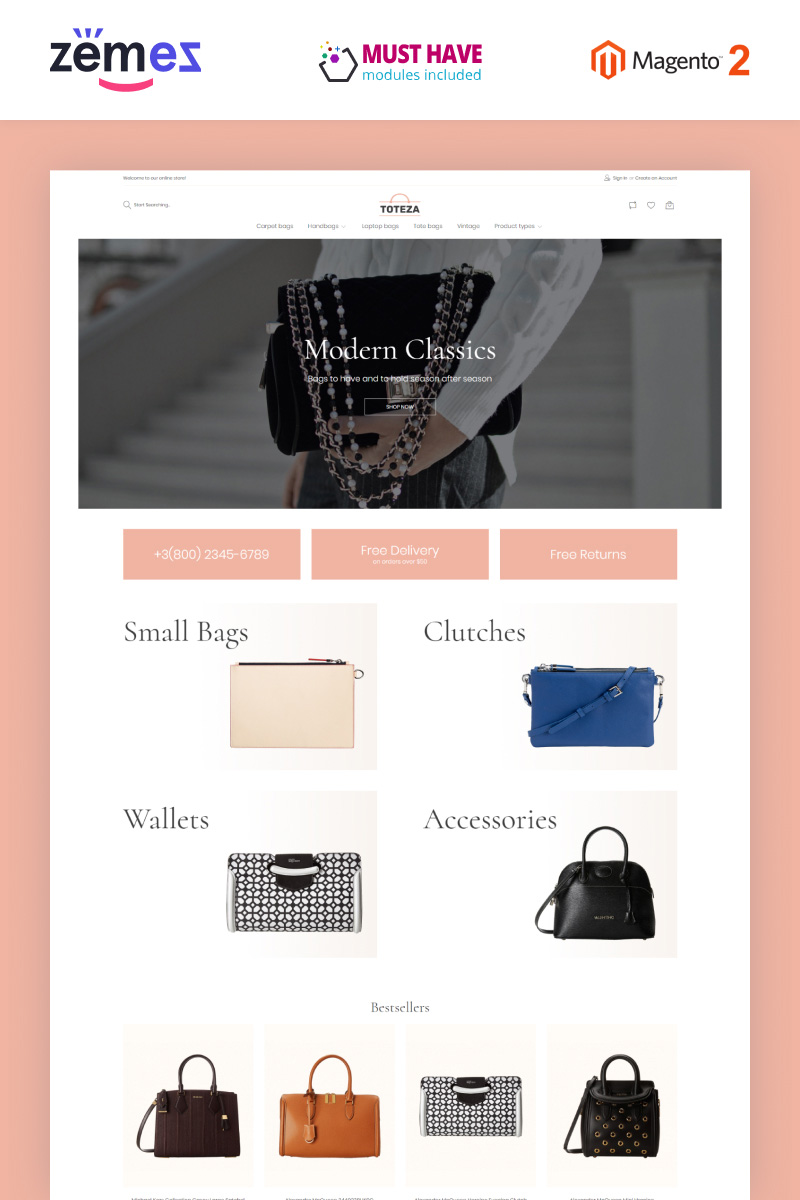 Toteza - отлично подходит для сайтов на тему Магазин сумок. Magento продаваемый шаблон - Bags Store Template Magento Theme.