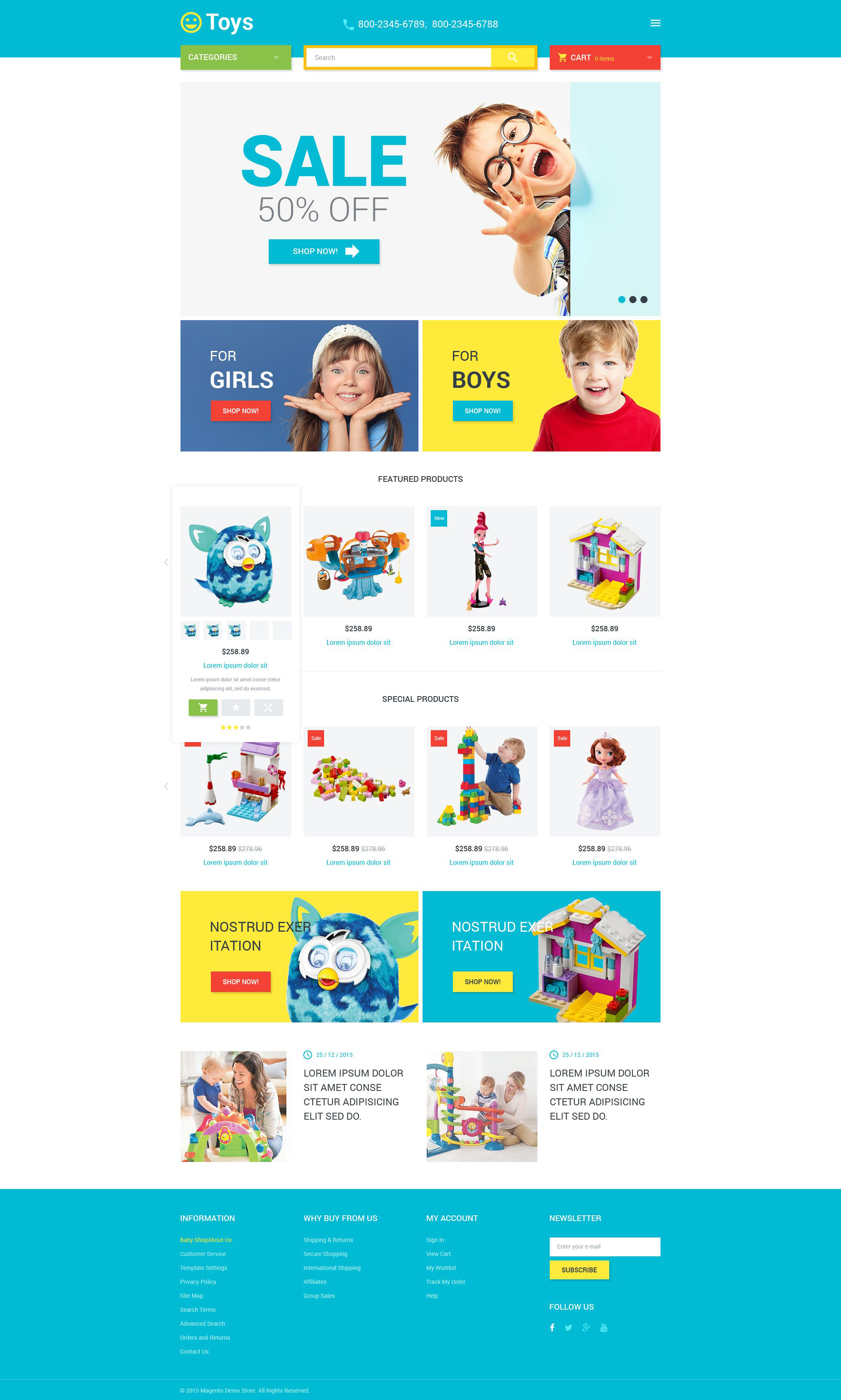 Toy Store - превосходно подойдет для сайтов в категории Детские игрушки. Magento популярный шаблон - Toys Store Magento Theme.