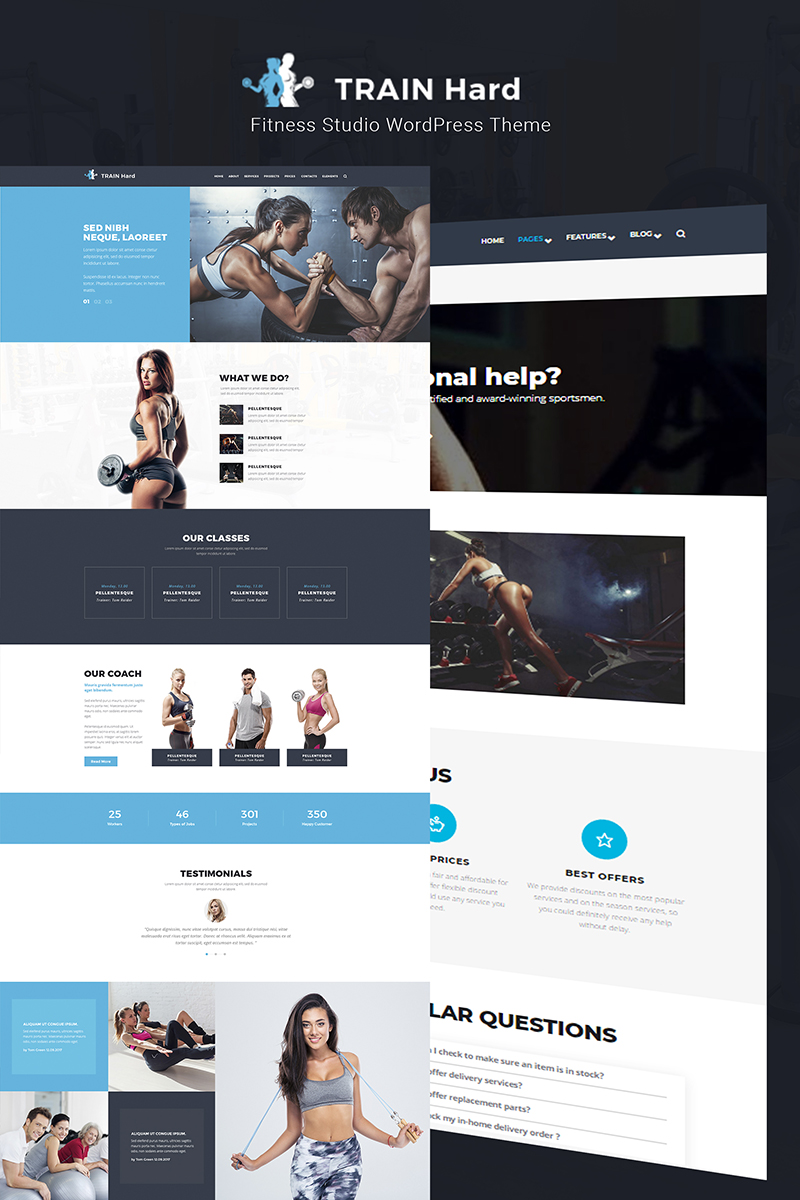 Bodybuilding - подходит для сайтов в области Бодибилдинг. WordPress продаваемый шаблон - Train Hard Fitness WordPress Theme.