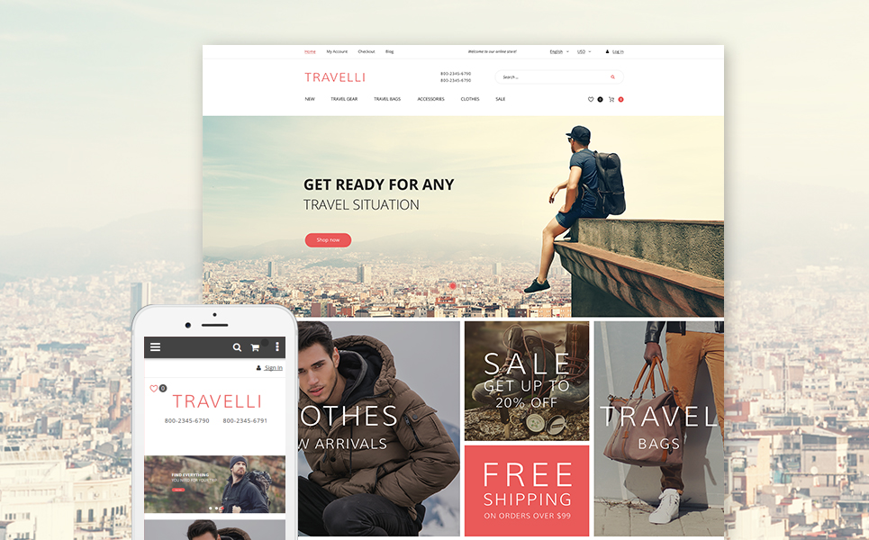 Travelli - превосходно подойдет для сайтов в области Альпинизм. Magento новый шаблон - Travel Equipment & Tourist Gear Magento Theme.