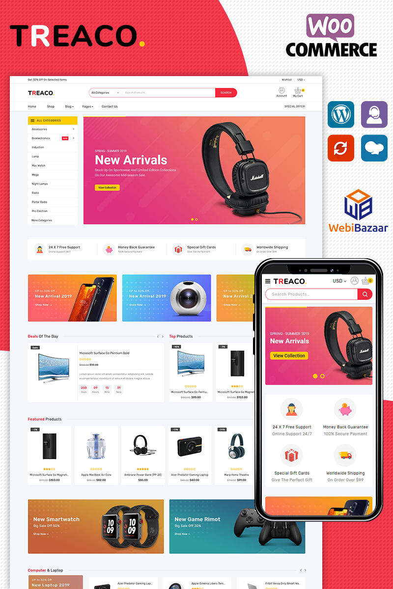 Treaco - подойдет для сайтов в области Веб-дизайн. WooCommerce интернет-магазин Wordpress - Electronic Multipurpose Store WooCommerce Theme.