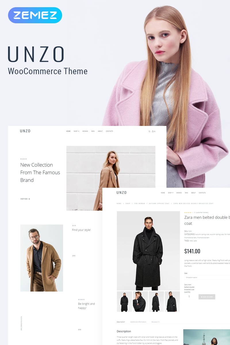 Unzo - превосходно подойдет для сайтов в категории Модный магазин. WooCommerce шаблон интернет-магазина Wordpress - Apparel Shop ECommerce Minimal Elementor WooCommerce Theme.