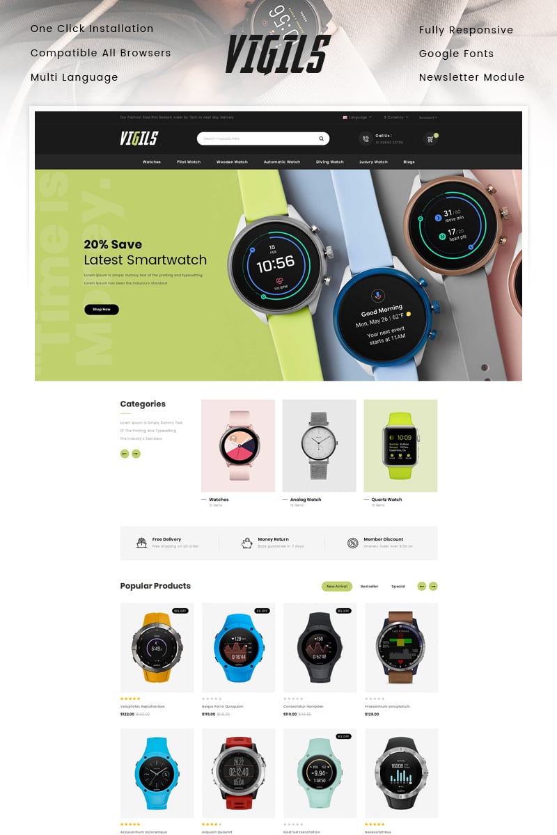 OpenCart шаблон для сайта интернет-магазина - Vigils - Smart Watch Store OpenCart Template, идеально подойдет для сайтов на тему Часы.