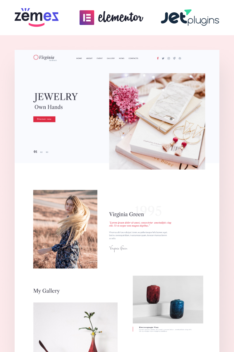 WordPress минималистичный шаблон - Virginia - Website Template for Handmade Jewelry with Elementor Builder WordPress Theme, превосходно подойдет для сайтов Ювелирные украшения.