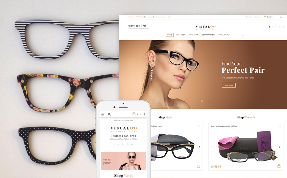 Magento профессиональный шаблон - Visualoo - Optics & Optometry Magento Theme, хорошо подойдет для сайтов в области Солнцезащитные очки.