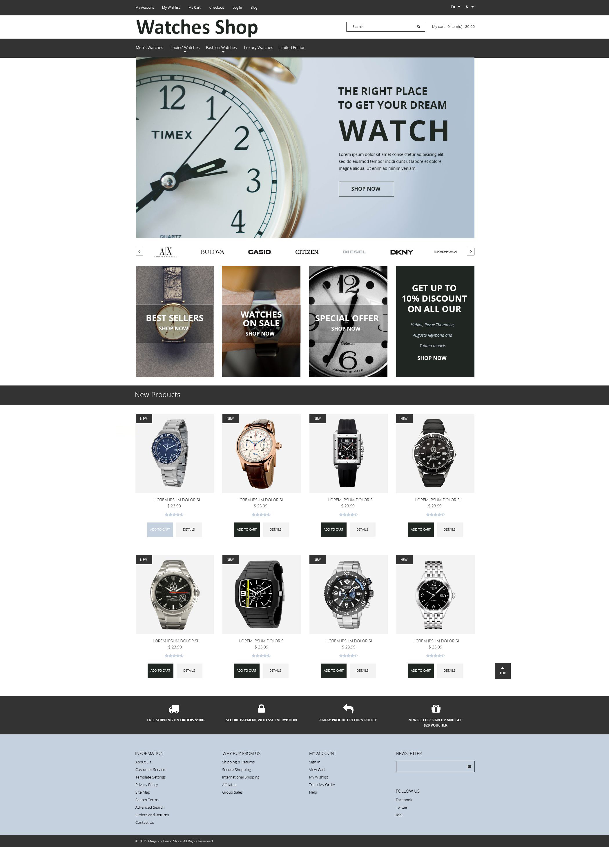 Magento мультишаблон для сайта - Watches - Watches Shop Magento Theme, хорошо подходит для сайтов в области Часы.
