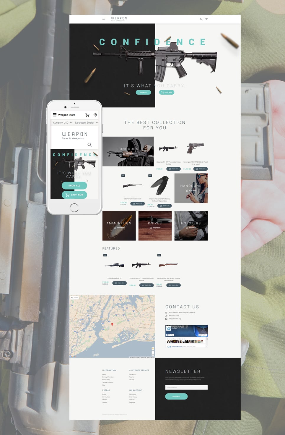 OpenCart шаблон для сайта интернет-магазина - Weapons Store - Weapon OpenCart Template, отлично подойдет для сайтов в области Оружейный магазин.