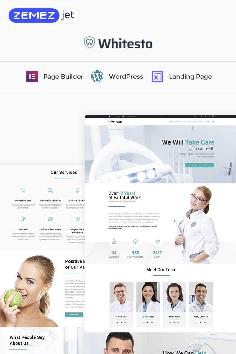 Whitesto - превосходно подходит для сайтов в области Медицина. Лендинг шаблон для одностраничного сайта - Dental Clinic Elementor WordPress Landing Page Template.