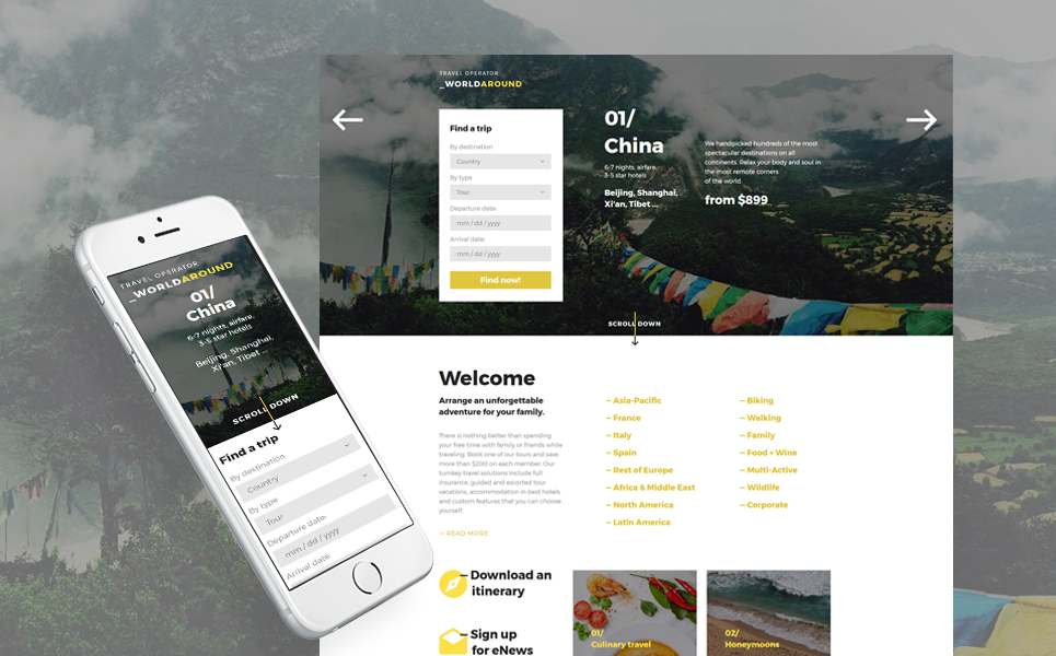 WorldAround - идеально подходит для сайтов в категории Агентство путешествий. Лендинг шаблон одностраничного сайта - Travel Operator Landing Page Template.