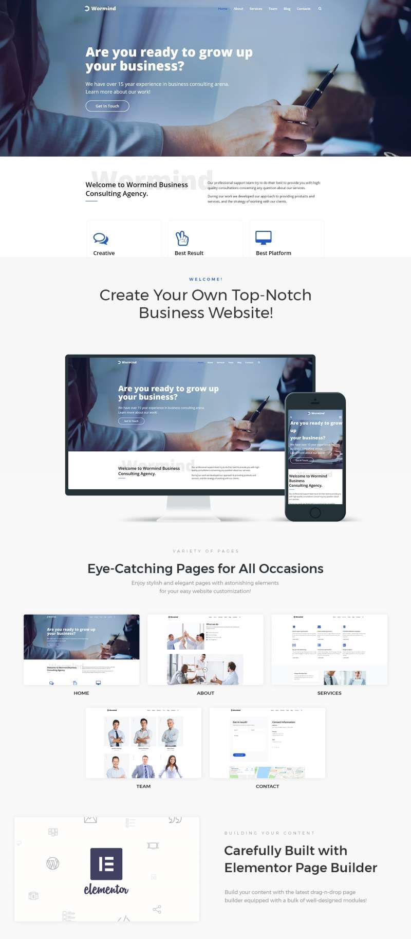 Wormind - хорошо подходит для сайтов Бизнес услуги. WordPress продаваемый шаблон - Business Multipurpose Classic WordPress Elementor Theme.