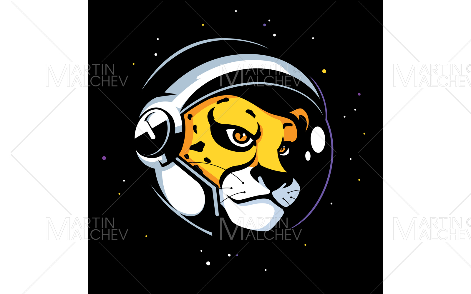 Download Иллюстрация "Cheetah Astronaut Mascot" / Cheetah Astronaut Mascot - Иллюстрация на тему графика astronaut,cheetah,cat,focused,cosmonaut,yellow,space,tense,helmet,deep,star,mascot,art,brooding,illustration,universe,face,fun,suit,drawn