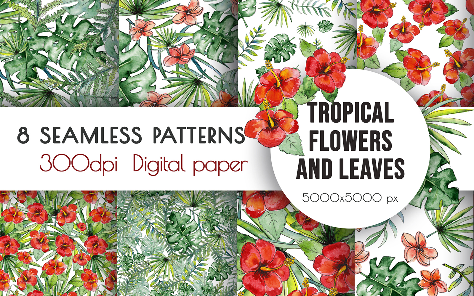 Download Pattern "Watercolor Tropical Flowers Seamless Pattern" / Watercolor Tropical Flowers Seamless Pattern - Pattern на тему графика flowers seamless,seamless texture,leaves digital paper,leaf background,floral background,watercolor wallpaper,original art,garden clipart,bouquet clipart,tropical clip art,tropical leaves,tro