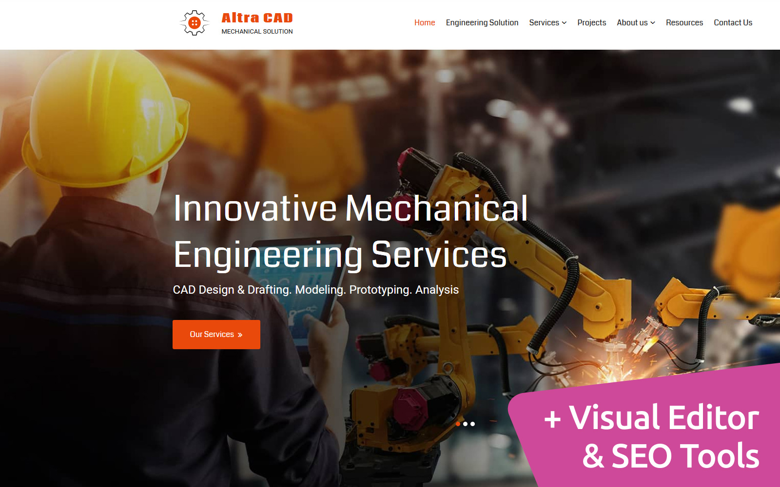 Moto CMS 3 отличный шаблон - Altra CAD - Mechanical Solution Moto CMS 3 Template, идеально подойдет для сайтов на тему Промышленность.