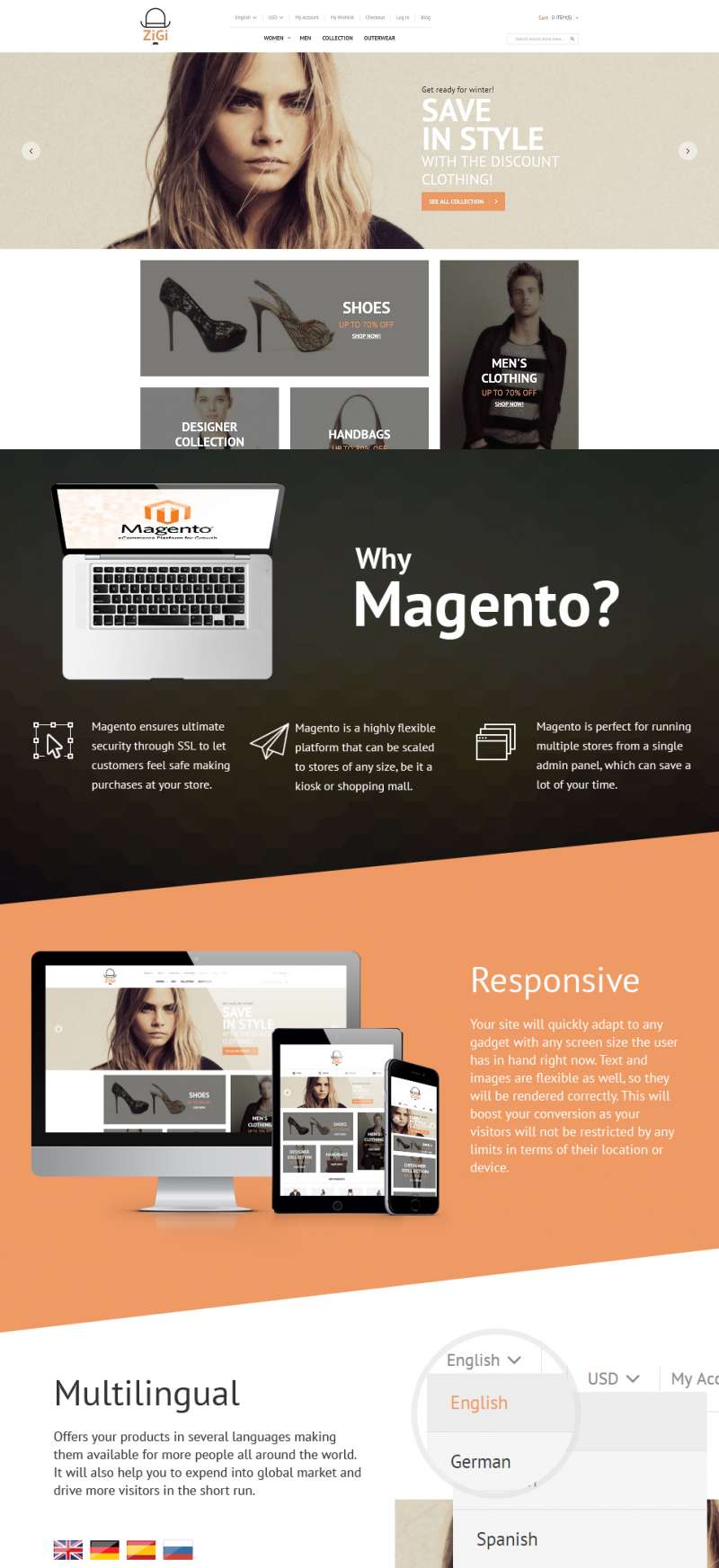 Мой клиент хочет перенести свой текущий веб-сайт Magento, построенный в 2012 году, на удобный для мобильных устройств шаблон и выбрал этот шаблон для своего нового сайта. Он любит чистый дизайн и современную функциональность шаблона одежды.