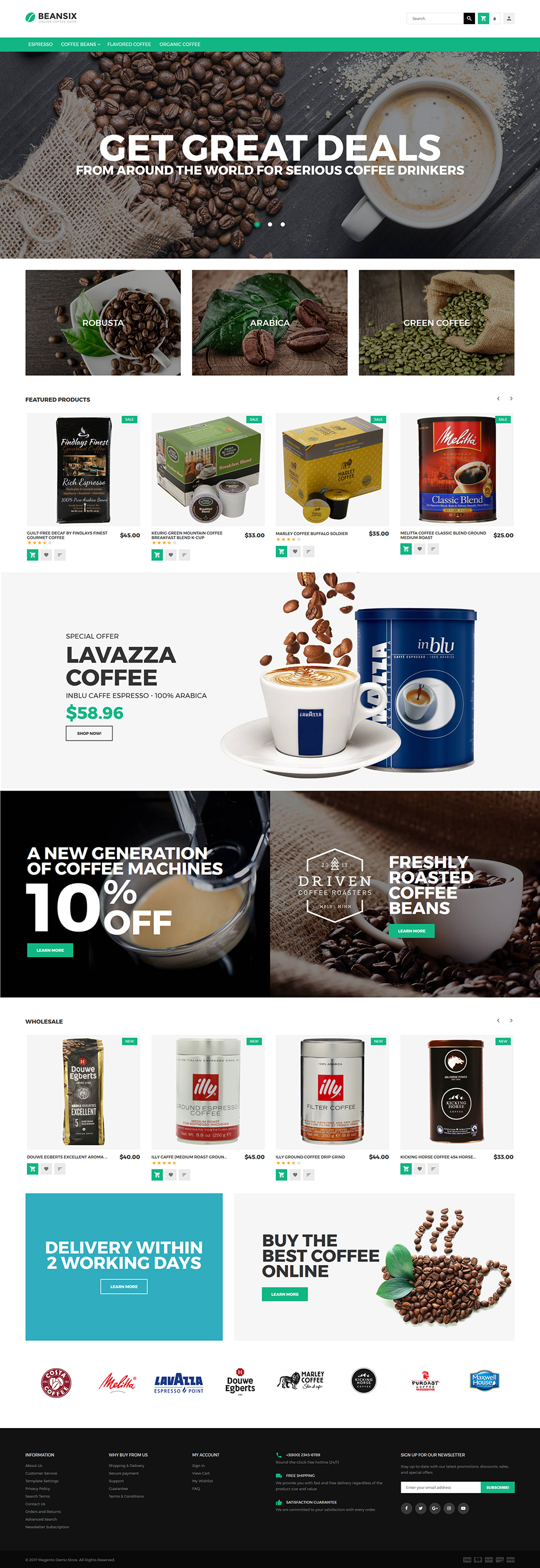 Beansix - хорошо подходит для сайтов в сфере Кофейня. Magento шаблон сайта - Coffee Shop Magento Theme.