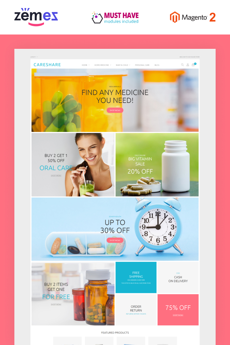 Magento продаваемый шаблон - CareShare - Medicine Online Website Magento Theme, идеально подойдет для сайтов Аптека.