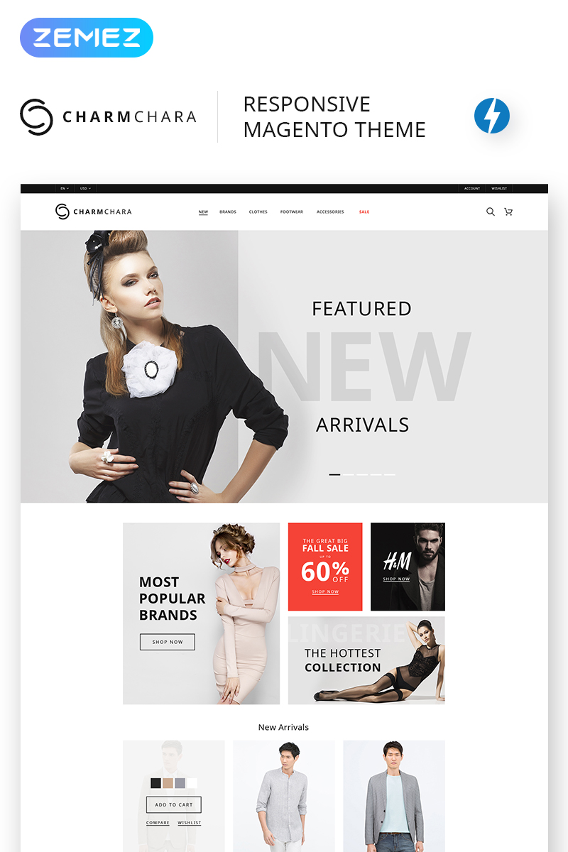 CharmChara - отлично подходит для сайтов в области Магазин одежды. Magento шаблон сайта - Fashion Store Magento Theme.