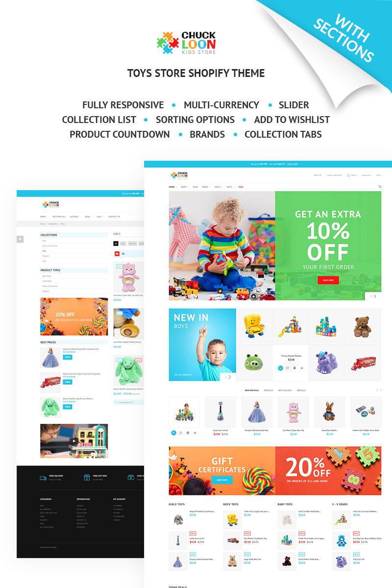 Chuck Loon - хорошо подходит для сайтов в категории Детские товары. Shopify интернет-магазин для сайта - Responsive Toys & Children Clothes Online Store Shopify Theme.